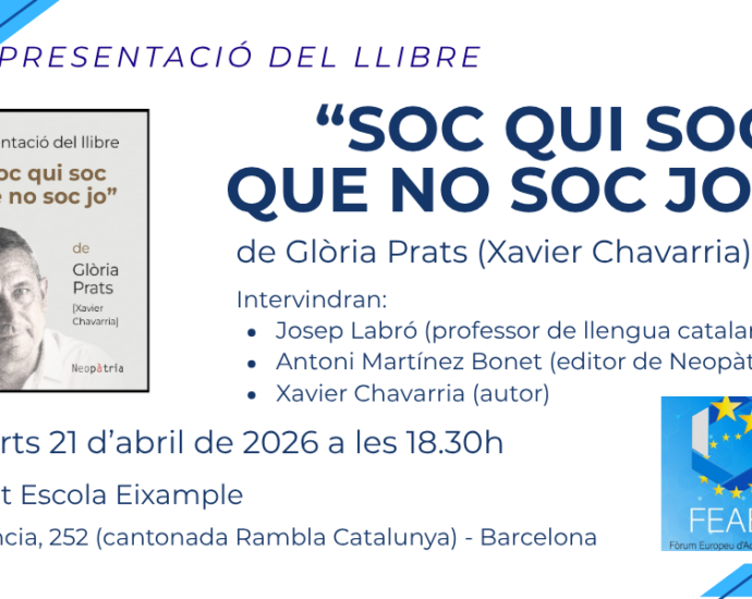El nostre company Xavier Chavarria -alter ego de Glòria Prats-, molts anys vinculat al FEAEC, fa la presentació d’un llibre que que ben segur que si heu llegit algun relat del seu bloc us vindran ganes d’escoltar en directe la seva visió de la vida, de l’educació, dels moments queContinue Reading